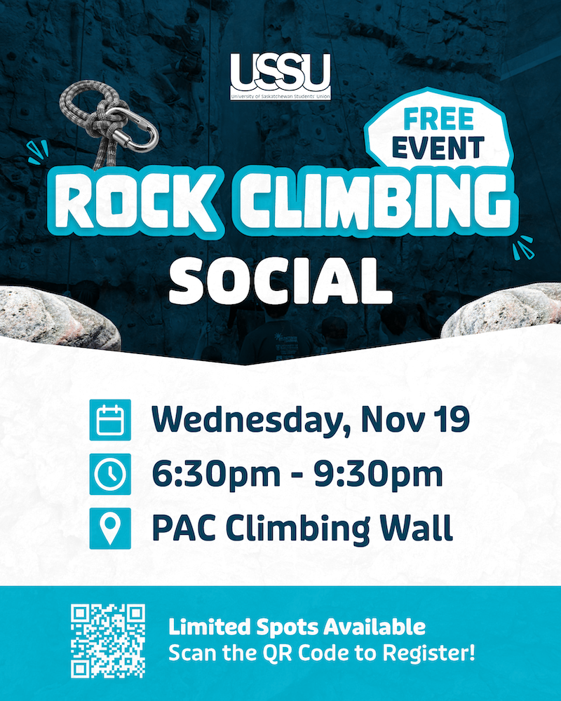 November 19 @ 6:30 pm - 9:30 pm Rock Climbing Social PAC 234 87 Campus Dr, Saskatoon, SK, Canada Free
