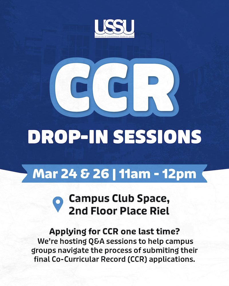 Campus Group CCR Drop-in Sessions March 24 @ 11:00 am - 12:00 pm Campus Group CCR Drop-in Sessions USSU Campus Club Space 1 Campus Drive (2nd floor), Saskatoon, SK, Canada